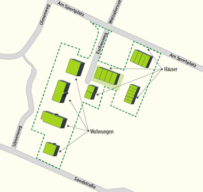 - Mehrfamilienhäuser mit Wohnungen gruppieren sich um eine interne Erschließungsstraße